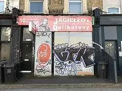 ![]() Frontage of a Polish shop in Forest Hill, of which the Polish name, Jagiełło's Delikatesy, incorporates the English possessive | |