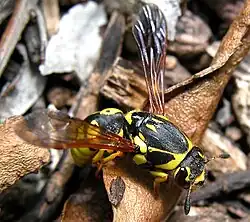 Pollen wasps, the Masarinae, are unusual wasps that are typically treated as a subfamily of Vespidae, but have in the past sometimes been recognized as a separate family, "Masaridae", which also included the subfamilies Euparagiinae and Gayellinae.[1] It is a small subfamily, unique among wasps in feeding their larvae exclusively with pollen and nectar, in a fashion quite similar to many solitary bees. Most species are black or brown, marked with strikingly contrasting patterns of yellow, white, or red (or combinations thereof). They are most diverse and abundant in the desert regions of southern Africa, but also occur in the deserts of North and South America. Some species of Pseudomasaris in California, such as Pseudomasaris vespoides, bear a remarkable resemblance to yellow jackets, but can be recognized by their strongly clubbed antennae, a characteristic feature of the subfamily. Males have greatly elongated antennae, but still ending in a strong club.[2]
