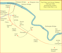 The line opened on 22 August 1840,[9] "from Rutherglen to the Broomielaw Harbour", after two further acts of Parliament were obtained, the Polloc and Govan Railway Act 1831 (1 & 2 Will. 4. c. lviii) and the Polloc and Govan Railway Act 1837 (7 Will. 4 & 1 Vict. c. cxviii), authorising considerably more capital: £36,000 in share value.[5] Cobb suggests that the 1840 opening was from Polmadie Bridge, i.e. Dixon's ironworks and coalpits, with an eastward extension to a station at Rutherglen in 1842.[4][6][1]