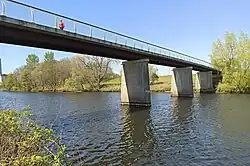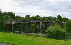 The replacement bridge, being four feet (1.2 metres) narrower than its predecessor, was constructed in 1954–1955, made from prestressed concrete.[4] It was closed by Glasgow City Council on 14 May 2015, for reasons of public safety.[5] Press Reports dated 16 July 2015 indicated the bridge was to be demolished – leaving concrete piers, and allowing restrictions on the stretch of river to be removed. Work to remove the bridge deck, leaving the concrete piers in place, began in October 2015.[6][7] Demolition took about five months, after which access to footpaths along the riverbanks was restored.[8]