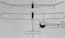 The empennage consisted of a single-piece rudder and an all-flying elevator.[3] The leading edge of the elevator was connected to the rear of the fuselage's boom, with the leading edge of the rudder being attached to the trailing edge of the elevator.[4] There were no ailerons, with lateral control intended to be achieved by lateral movement of the pilot.[4] The aircraft was primarily constructed from spruce and balsa. The undercarriage consisted of a single monowheel, made from balsa, fitted with a 12.50 cm (5 inch) pneumatic tyre. Stabilising outriggers were located at the rear of the fuselage and under each wing.[3]