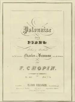 The Polonaise in F-sharp minor, Op. 44, is a piece for solo piano written by Frédéric Chopin in 1841. It is often referred to as the "tragic" polonaise, due to its dark nature.[1] The polonaise is dedicated to Princess Ludmilla de Beauvau, a prominent member of the Polish émigré community in Paris.[2]