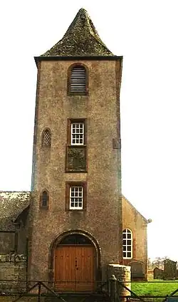 In 1567, Adam Hume, 3rd son of the 4th Baron of Polwarth was the first rector at the church after the Scottish Reformation.[3] Later, in 1683, Sir Patrick Hume was implicated in the Rye House Plot and he hid for four weeks in the crypt at Polwarth Church to escape detection.[4] His daughter, Grizel, later Lady Grizel Baillie took him food during his self-imposed imprisonment.[5] The church was virtually rebuilt in 1703 on the same site as the previous churches and contains parts of the earlier buildings. Polwarth Kirk is protected as a category A listed building: "Prominently sited, well-detailed and surprisingly intact, Polwarth Church remains one of the most significant buildings in the parish and indeed, within Scotland as a whole".[6] The church is built of rubble below a slated roof. The 'T' shape building is highlighted by a four–stage tower, and the interior was extensively renovated in the 20th century. The church also contains the Marchmont family crypt which can be seen through a grille at the bottom of the east wall.[7]