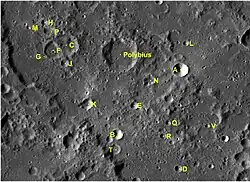 By convention these features are identified on lunar maps by placing the letter on the side of the crater midpoint that is closest to Polybius.