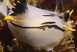The crowned nudibranch is a smooth-bodied, variably coloured nudibranch. The ground colour is white or grey and there are usually black, yellow or orange stripes longitudinally along the notum, though these can be absent. The head has six yellow projections. The gills and rhinophores are black, and may be spotted with yellow. Alongside the gills is a pair of yellow projections. The animal may reach 50 mm in total length.[5]