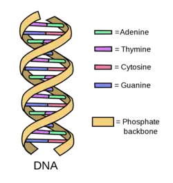 This concept works in tandem with the view of the gene as an "aperiodic crystal" as proposed by Erwin Schrödinger in his 1944 book "What Is Life?".[4] An aperiodic crystal, as Schrödinger describes it, has a discrete set of molecular building blocks in a non-repeating arrangement. DNA is an aperiodic crystal composed of discrete nucleobases (A, T, C, and G), which are arranged based on the information they encode, not in any repeated format. While this idea of an "aperiodic crystal" was not initially linked to the polyelectrolyte theory of the gene, Benner, in later work, connected the two.[3][1]