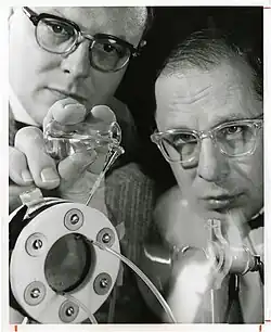 Early proton-exchange membrane technology was developed in the early 1960s by Leonard Niedrach and Thomas Grubb, chemists working for the General Electric Company.[6] Significant government resources were devoted to the study and development of these membranes for use in NASA's Project Gemini spaceflight program.[7] A number of technical problems led NASA to forego the use of proton-exchange membrane fuel cells in favor of batteries as a lower capacity but more reliable alternative for Gemini missions 1–4.[8] An improved generation of General Electric's PEM fuel cell was used in all subsequent Gemini missions, but was abandoned for the subsequent Apollo missions.[9] The fluorinated ionomer Nafion, which is today the most widely utilized proton-exchange membrane material, was developed by DuPont plastics chemist Walther Grot. Grot also demonstrated its usefulness as an electrochemical separator membrane.[10]
