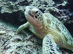 Pom Pom island is an important nesting and feeding site for green and hawksbill turtles. All the 6 northeast Semporna Islands are nesting beaches and many of the stakeholders in the area are working towards better protecting the turtles and reef environments. The green turtle nests year-round but peak nesting is May to September. The hawksbill nests in small numbers. Both turtles are present on the reef throughout the year with an average of 7 green turtles seen per hour on a dive or snorkeling trip. The hawksbill is both less common and more territorial with individuals being regularly seen at the lobster wall, the North Tip and Magic Rocks.