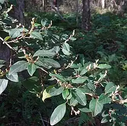 Pomaderris bodalla, commonly known as Bodalla pomaderris,[2] is a species of flowering plant in the family Rhamnaceae and is endemic to New South Wales.[3] It is a shrub with hairy young stems, elliptic to more or less rhombic leaves, and dense clusters of cream-coloured flowers.