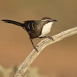 Chestnut-crowned babblers are dark, brown-grey birds with a white throat and breast, white-tipped tail and a long, black, down-curved bill. Wings are short and rounded and the tail is long with a rounded tip. Diagnostic features include two white wing bars and a rich, chestnut crown highlighted by long, white eyebrows.[5] The birds have dark brown eyes and grey legs, while the wings, back and flanks are brown-grey to mottled dusky on the mantle. The white of the throat and breast is well-defined and narrower than that of the similar, white-browed babbler (Pomatostomus superciliosus).[6] Combined, these characteristics give the chestnut-crowned babbler a rather unusual appearance.[5]