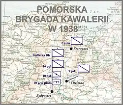 Pomeranian Cavalry Brigade (Polish: Pomorska Brygada Kawalerii) was a cavalry unit of the Polish Army in the interbellum period. It was created on April 1, 1937 out of the Cavalry Brigade "Bydgoszcz". Its headquarters were stationed in Bydgoszcz and the brigade consisted of these units: