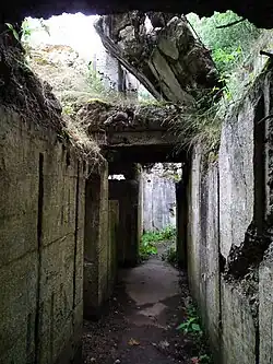 After World War I, Germany was forced to cede territory to Poland, leading to the creation of a Polish corridor separating Pomerania from East Prussia. Germany began constructing the Pomeranian Wall in 1932 on their side of the coridor in Pomerania to defend their positions in case of a Polish attack. Fortifications took advantage of the landscape dominated by small lakes. In total, about 900 buildings were constructed as part of the wall, with its concrete bunkers being similar to the arch bunkers of the Festungsfront Oder-Warthe-Bogen. Under the new Nazi government, the wall saw extensions to near Neustettin, and the area between Vilzsee and Dolgensee in 1934. At Tütz Castle, its embarkment was reinforced with concrete bunkers between 1934 and 1937.[4] Work on the wall ended in 1937 to concentrate more focus on the Siegfried Line in the west.[5] It was not until 1944 that work resumed. Key points along the lines were at Neustettin and Deutsch-Krone.[4]