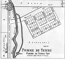 A post office existed during the years 1868-79, and 1880 to 1902.[1] At its height, Pomme de Terre had two stores, two blacksmith shops, a grist mill, elevator, hotel and saloon.