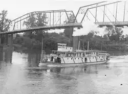 Pomona was reconstructed in 1926.[3] The reconstructed boat was much smaller, rated at 216 gross tons and 120 net tons.[3] The new boat was designed to pass under the draw of the Kelso bridge on the Cowlitz river.[43] While the Kelso bridge was a lifting span, the rebuilt Pomona was intended to be able to pass under the bridge without having to raise it.[44] The length was reduced from 134 feet to 120 feet.[29]