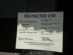The building is reported to be one of the oldest municipal buildings extant in California.[4] In 2003, the Pomona Historic Preservation Commission recommended recognition of the stables building as a historic landmark,[5][6] and the building was added to the National Register of Historic Places in October 2004. However, the listing of the building has not led to any cessation of the building's deterioration. Located in the middle of a fenced-off yard used by the City of Pomona for storage of municipal vehicles, fuel, and other materials, the building has fallen into a serious state of disrepair and dilapidation. After the July 2008 Chino Hills earthquake, city officials posted a sign (pictured at left) on the entrance to the stables restricting access due to its dilapidated condition. After severe winter rains, the stable walls partially collapsed in 2017. The stables were fully demolished by the city of Pomona in Fall of 2022.