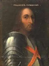 The Colonna family suffered a major disaster, when Pompeo's uncle, Prospero Colonna, was defeated and captured at Battle of Marignano on 14 September 1515. Prospero had been the leading general of the Sforza of Milan, and had been leading a force of Milanese and Papal troops, along with the Swiss, against the Genoese, who were reinforced by the French, led by the young King Francis I and the Chevalier Bayard. Prospero was defeated, captured, and deported to France.[21] Bishop Pompeo Colonna made the journey to France to effect his release. Travelling in the middle of the winter of 1515–1516, he was caught in an avalanche which engulfed an embassy from Sion just a few steps in front of him. Reaching France, he spent six months until the French king made a decision. King Francis, meditating on a plan to reclaim the Angevin kingdom of Naples, and realizing that he would need the friendly cooperation of the Pope and assistance in the Papal States, generously agreed to release Prospero Colonna, on the condition that Prospero agree in writing to serve under Francis' banner. Having reached Italy, however, Prospero began to raise troops to put at the disposal of Charles V at the siege of Verona. Prospero sent his nephew Pompeo on an embassy to the Emperor Maximilian and King Charles, and charged him with winning over King Ferdinand, Max's grandson. In this he was successful. Ferdinand provided Pompeo with money, and he proceeded through Germany to Bruxelles, where he engaged in discussions with Prince Charles, who was then Duke of Burgundy and an Austrian Archduke. He was then recalled to Rome by his uncle.[22]