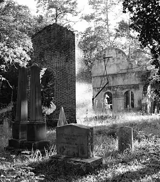Pon Pon Chapel was built in 1820 in Jacksonboro, South Carolina. It was located "on Parker’s Ferry Road, the busy stagecoach thoroughfare that connected Charleston, South Carolina and Savannah, Georgia."[2][3] Today, Parker's Ferry Road is a barely paved road along the south side of a power line right of way, and the ruins of the chapel can be found along this road east of Jacksonboro Road (State Road S-15-40).