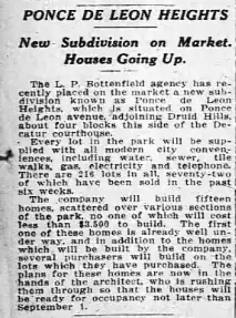The name of the community is apparently derived from fronting on the north side of Ponce de Leon Avenue, and from the hilly terrain of west Decatur. Ponce de Leon Heights homes were primarily constructed starting in 1914, sit on small lots and include many examples of Craftsman bungalows architectural style. Streets in the community include Clarion Ave., Nelson Ferry Rd., Woodlawn Ave., Fairfield St. and the southeast leg of Coventry Rd.