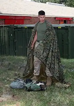 A poncho liner (often nicknamed a woobie)[1] is a piece of field gear originating in the United States military that can be attached to a standard issue poncho to provide additional warmth, as well as being usable as a blanket, sleeping bag[2] or tarp/protective cover.[3] It consists of quilted nylon with a polyester filling,[4] same materials as the liners for the US military fishtail parka and M65 Field jacket. It is attached to the poncho by means of integral lengths of material which are looped through the poncho's eyelets.