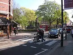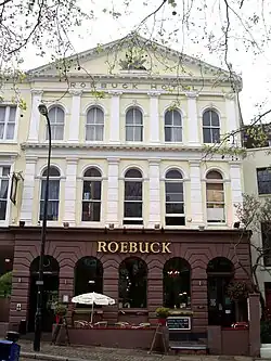 At the western end is St Stephen's, a former church designed in Gothic Revival style by Samuel Sanders Teulon around 1870.[3] What remains of the once larger Hampstead Green is nearby. Hampstead Hill Gardens heads off northwards from Pond Street. The Roebuck Hotel, on the northern side, dates from the late 1860s.[4] The Royal Free Hospital, built in the 1970s, is on the southern side of the street.[5]