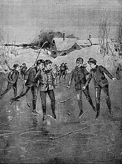 Pond hockey is just like indoor ice hockey but is played outdoors and most of the time on a lake or pond. Pond hockey tournaments are typically played four on four but when playing casually there is no set number of players on a team, though the players try to balance the sides as best they can. Depending on equipment and player's availabilities, pond hockey may or may not use a goalie. If a goalie is not used, the goals can be defined with anything from open, regular hockey nets to player's boots.[1] Since pond hockey started the popularity has soared, official pond hockey tournaments are found across the globe. Pond hockey tournaments have entwined the concept of youth pick-up hockey into a serious art form. The rink can range from any size or shape but they typically resemble a scaled-down regular indoor ice hockey rink. Some pond hockey rinks use boards, however, in most, the surrounding piled up snow from clearing the pond or lake makes a good substitute. In some of the more prominent pond hockey tournaments official ice hockey boards are used. One rink for example, the rink from the U.S. Pond Hockey Championship is set up into 155-foot (47 m) long ovals.[2]