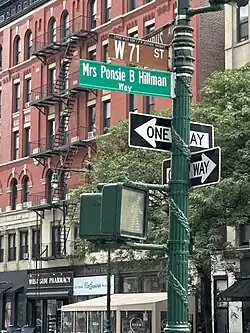 On September 17, 2017, the northwest corner of Columbus Avenue and West 71st was renamed "Mrs. Ponsie B. Hillman Way". At her street naming, a statement from Barack Obama referring to Hillman was read: "We stand on the shoulders of giants who helped form a more perfect union. Our heritage is forged by men and women who organized, agitated and advocated for change, who fought to build a nation where no one is a second-class citizen and no one is denied basic rights."