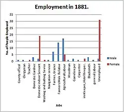 The Employment graph of 1881 shows there are many more men employed in the village than women. Women were often 'Home Workers' meaning that they would do domestic duties around the home. The sector that employed the most women is the Domestic Indoor Servant, essentially meaning that they were doing domestic duties in wealthy households within the community. The male population of Ponsonby were largely employed in the agricultural sector, either being a farmer, a farmer's son or male relative or an agricultural worker. The graph shows that there are very few people employed in high paying jobs, this could be due to the lack of education within the area.