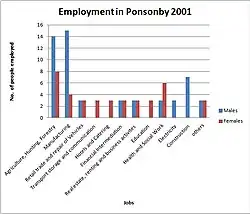 The employment graph of 2001 shows there has been an increase in the number of women employed in Ponsonby and an increase in the different sectors that people are employed in. There are a lot more people employed in 'office' jobs now compared to 1881, however agriculture is still the biggest employer. There is an increase in women working in Agriculture and Manufacturing, but males still dominate this area of work. From the graph it is apparent that there is more people travelling away from the village to work in cities where the 'office' jobs are located. There has also been an increase in the variety of Jobs that people from Ponsonby are working in, during 1881 many of the jobs were practical jobs and manual jobs, however there has now been a switch and the majority of people are working in 'office' jobs or terrestrial jobs.