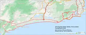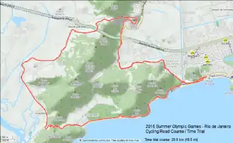 The men's and women's Olympic cycling time trials were held August 10, 2016 on the 29.8 km (18.5 mi) Grumari circuit. The race start of the course was set to be at the Tim Maia Square (Estrada do Pontal), then entered the Grumari circuit (clockwise) to reach the first climb (Grumari climb) after 9.7 km and the second climb (Grota Funda climb) at 19.2 km, before finishing back in Pontal at the Av Lucio Costa.[ 4]