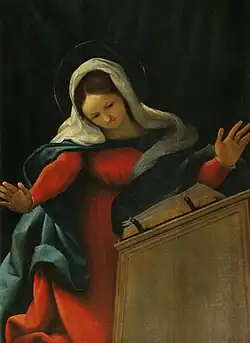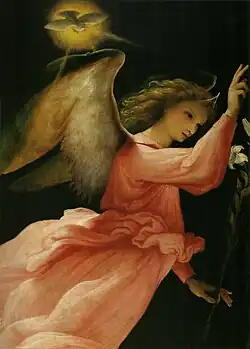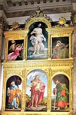 The Ponteranica Altarpiece is a six-panel oil painting series produced by Lorenzo Lotto in 1522, commissioned by the Scuola del Corpo di Cristo for the parish church of San Vincenzo e Sant'Alessandro in Ponteranica, where it still remains.[1] Its upper register shows the risen Christ flanked by an Annunciation scene, whilst below is John the Baptist flanked by saints Peter and Paul.