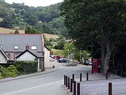 ![]() Road into Pontfadog, showing former tramway waiting room (at left) and inn sign (centre) | |