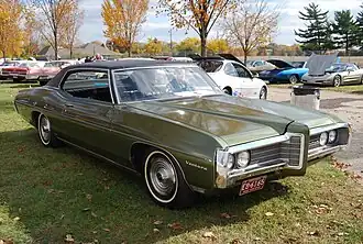 The Ventura was first introduced for 1960 as a custom trim package on the Pontiac Catalina's 123-inch B-body wheelbase, and was only available as the Vista four-door hardtop, or the Sports Coupe two-door hardtop.[2] It was offered all standard and optional equipment from the Catalina, and added unique exterior identification, deluxe wheel covers, a sport steering wheel, and distinctive tri-tone "Morrokide" upholstery.[3] It was more expensive than the longer Pontiac Star Chief but was priced below the top-level Pontiac Bonneville.[1]