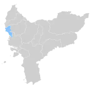 Pontianak Hakka is spoken in Pontianak and various regencies across western and central West Kalimantan, including Kubu Raya, Landak, Mempawah, Sanggau, Sekadau and Sintang. Meanwhile, the Hakkas in Singkawang and nearby areas, such as Bengkayang and Sambas in northwestern West Kalimantan, speak a distinct variety of Hakka that more closely resembles Hailu Hakka, with significant influence from Hopo and Wuhua dialects.[4][13] Notable differences exist between Pontianak Hakka and Singkawang Hakka, particularly in their phonology and tonal system. The linguistic boundary between Pontianak Hakka and Singkawang Hakka follows the Duri River, which also serves as the political border between Bengkayang and Mempawah Regency.[10] In Pontianak, Hakka is primarily spoken in the northern part of the city, across the Kapuas River, and in its suburbs, while Teochew dominates the city center and southern Pontianak.[10][14] In addition, small yet significant Hakka communities can also be found in Kubu Raya Regency, just south of Pontianak.[15][16] Hakka is also spoken by Pontianak Chinese migrants living in Jakarta.[17]