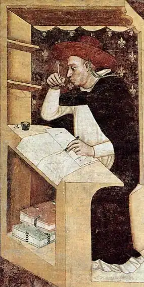 Nicholas Brunacci (1240–1322) was among Aquinas' students at the Santa Sabina studium provinciale and later at Paris. In November 1268 he accompanied Aquinas and his associate and secretary Reginald of Piperno from Viterbo to Paris to begin the academic year.[25] Albert the Great, Brunacci's teacher at Cologne after 1272, called him "the second Thomas Aquinas."[26] Brunacci became lector at the Santa Sabina studium and later served in the papal curia.[27] He was a correspondent by letter with Dante Alighieri during the latter's exile from Florence.[28]