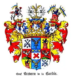 During the mid-19th Century, due to the absences of the male line. Pontus was chosen by his uncle Karl Magnus De la Gardie to inherit the surname and title of De la Gardie, thus creating the joint family of Brevern-de la Gardie.[8]