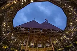 Based on this, Pop-up Globe's design was a 16-sided polygon, 88 feet (27 m) in external diameter. This was some 12 feet (3.7 m) smaller than Shakespeare's Globe in London, which some scholars and theatre practitioners had judged to be too large.[10][11] As a consequence of this smaller diameter, the 'yard' where audiences stand was around 40% smaller than the yard at Shakespeare's Globe.