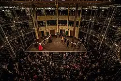 The interior design of the stage (43 feet (13 m) in width, as specified in the contract for the Fortune Playhouse) changed significantly between the first and second seasons. The first season employed a canted scaenae frons across four audience bays at the rear of the stage, with four doors in a neo-classical design. The audience was seated in 360°, with "Lord's" and "Gentlemen's" rooms in the middle and upper galleries behind the stage. Based on practical learnings from the first season, the 2017 season featured a flat scaenae frons with three doors in a baroque design, with the audience seated around 270°, with a balcony above the central door, and a musician's gallery above the balcony.[12]