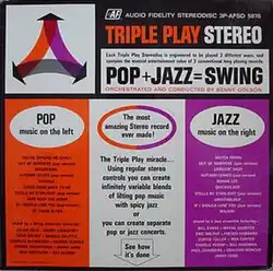 Pop + Jazz = Swing is an album arranged and conducted by Benny Golson featuring performances recorded in 1962 and originally released on the Audio Fidelity label.[2] Record producer Tom Wilson was involved in the sessions and wrote the album's liner notes.[3] The album utilised stereophonic sound to present a jazz group on the right channel and an 11-piece pop orchestra playing the same song or a related tune on the left channel which could be separated or mixed by the listener.[4] The related jazz tunes are contrafacts or borrowed chord progressions where new melodies are overlaid on an existing harmonic structure.