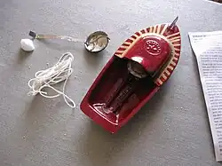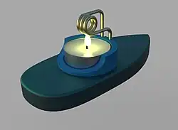 A pop-pop boat (also known as a flash-steamer, hot-air-boat, or toc-toc after a German version from the 1920s[1]) is a toy with a simple steam engine without moving parts, typically powered by a candle or vegetable oil burner. The name comes from the noise made by some versions of the boats.