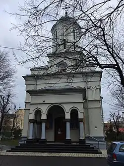 The first small, single-domed church on the site was built in 1719. A second one, of masonry, probably dated to 1764–1765, as attested by an older pisanie. It underwent repairs in 1802, 1845, 1860 and 1886. In ruins by 1909, it collapsed one night in July 1910. The current church was built from the foundations between 1910 and 1918, with Cristofi Cerchez as architect. The interior frescoes date to 1918–1920. The 1977 earthquake caused serious damage, including the collapse of the nave dome. Repairs lasted until 1986. The interior was repainted from that point until 1988, and the newer artwork features the national tricolor as a motif. In October 1989, Patriarch Teoctist, joined by a large group of priests, rededicated the church.[1]