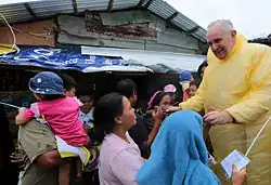 After Aquino's speech, Francis made his first public speech and tackled the issue of corruption in the country. He urged political leaders to be "outstanding for honesty, integrity, and commitment to the common good." He added that they must listen to the concerns of the poor and tackle the "glaring and indeed scandalous social inequalities" in society. The pope also called on Filipinos "at all levels of society to reject every form of corruption which diverts resources from the poor, and to make concerted efforts to ensure the inclusion of every man, woman, and child in the life of the community."[28] The pope also hailed the resiliency of millions of Filipinos who were affected by Typhoon Yolanda (Haiyan). "This visit is meant to express my closeness to our brothers and sisters who endured and suffered loss and devastation caused by typhoon Yolanda," Francis said, using the local name of the typhoon. "I admire the heroic strength, faith, and resilience demonstrated by so many Filipinos in the face of natural disaster," he added.[29]