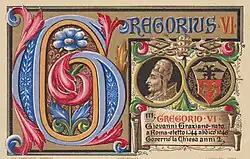 Pope Gregory VI (Latin: Gregorius VI; died 1048), born Giovanni Graziano (John Gratian) in Rome (Latin: Ioannes Gratianus), was bishop of Rome and ruler of the Papal States from 1 May 1045 until his resignation at the Council of Sutri on 20 December 1046.