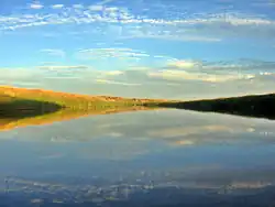 Poplar River and its main forks of West, Middle, and East Poplar Rivers begin in the Wood Mountain Hills[5] in Saskatchewan. West Poplar River rises near Killdeer, Saskatchewan, and flows south-east, into north-eastern Montana, past Richland and across Daniels County.[6] On the Saskatchewan side of the West Poplar River in the RM of Old Post No. 43, there is the West Poplar Dam (49°11′26″N 106°26′29″W / 49.1906°N 106.4415°W). It is 9.9 m (32 ft) high, was built in 1957, and is owned and operated by the Saskatchewan Water Security Agency. It impounds the 1,196 dam3 (970 acre⋅ft) Devils Lake reservoir.[7] Poplar River (Middle fork) rises north-west of Rockglen, Saskatchewan, and flows south-east, into north-eastern Montana, and passes west of Scobey. The two forks unite in the northern part of Fort Peck Indian Reservation. The combined river flows south-east, then south-southwest, and joins the Missouri River near Poplar.