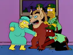 In another scene in the episode, Homer shows his family an advertisement for his security company. In it, a monster is seen breaking into an elderly woman's house. When the woman screams, the screen freezes and Homer is composited to the screen, instructing the audience about SpringShield's telephone number. In order to composite Homer into the screen, director Michels made use of a greenscreen.[5] The advertisement resumes and the monster is subdued by Homer, Lenny and Carl. Confused, the monster turns to Homer and asks, "friend?" to which Homer replies "the only friend you need is SpringShield," and holds a business card in front of the camera. The monster then puts the card in his wallet and says "monster put in wallet." The monster's last line was written during one of the episode's rewrites, but none of the writers on The Simpsons' writing staff has taken credit for it. The line has since become very popular with the series' writing staff; Jean said that it was "very funny and unusual for a television show,"[3] and Gould considers it to be his favourite joke in any episode he has ever written.[2]
