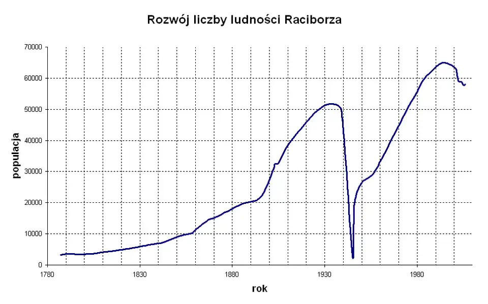 At the end of World War II, Racibórz had only around 3,000 inhabitants, but by a year and a half later, the population had grown to almost 20,000, and by the late 1950s, it surpassed 30,000. Over the following years, Racibórz continued to increase in population, peaking in 1991 at 65,300 residents. Despite this growth, the city gradually lost importance in the region, partly due to the rapid expansion of cities in the Upper Silesian Industrial Region and the formation of the Rybnik Coal Area in the 1960s.[3]