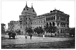 The name derives from the port city of Porbandar from where it was shipped to Bombay and other cities, and does not refer to the stone quarried in the city itself; there have been instances of the city stone, considered inferior to the original, being passed off as the genuine 'Porbandar' stone.[6] In addition to Bombay, the stone also appears in prominent buildings of Madras and Cochin.[7] The stone was highly prized by sculptors and architects, and during 1917-18 around 32,420 tonnes was sent outside the state to Calcutta, Madras, Karachi and Rangoon.[8]