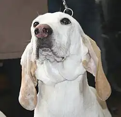 The Porcelaine gets its name from its shiny coat, said to make it resemble a porcelain statuette. The fur is white, sometimes with orange spots, often on the ears. The skin should be white with black mottling that is visible through the white coat. The fur is incredibly short and very fine. The nose of a Porcelaine dog is black with very wide nostrils. It also has black eyes and long ears that droop down. The neck is long and the tail starts thick and narrows to a point at the end.[3]