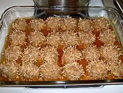Porcupine meatballs are an American casserole dish of ground beef and rice meatballs cooked in tomato sauce. They were a staple during the Great Depression requiring only a few basic ingredients: ground beef, uncooked long-grain rice, onion, and canned tomato soup.[1] The name comes from the appearance of the meatballs, which appear prickly when the rice pokes out of them as they cook, resembling a porcupine.