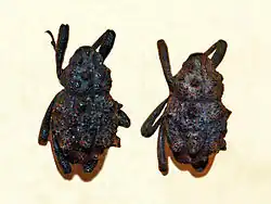 The basic colour is black or brown. The elytra and the pronotum are covered by tubercles.