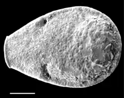 The organism consists of a pyriform, laterally compressed test with a rounded posterior end, two large invaginated pores situated on each lateral compression, both of which connected by internal tubes in Certesella. Small lateral pores are seen anterior to the large ones. Lateral keels, present in P. paracarinata but absent in P. bigibbosa, surround a third of the posterior lateral margins. The test itself is composed of euglyphid shell plates embedded in a disorganized cement. The test's aperture or "pseudostome" is surrounded with a lip made of organic compounds.[1]